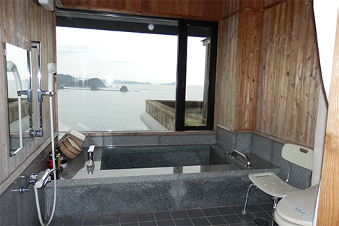 鰹乃國の湯宿【黒潮本陣】の客室は、太平洋を眼下に見下ろす眺めの良さでも定評があります。全11室の客室は、本館3F~4Fの海側に陣取り、どのお部屋からも太平洋の絶景がご覧いただけます。露天風呂、白御影石風呂(大浴場)、錆石風呂(大浴場)とは別に、各客室に内風呂もご用意しており、お時間を気にせずに何時でもご自由にお寛ぎいただけます。